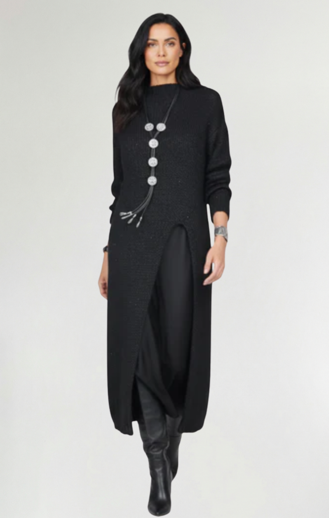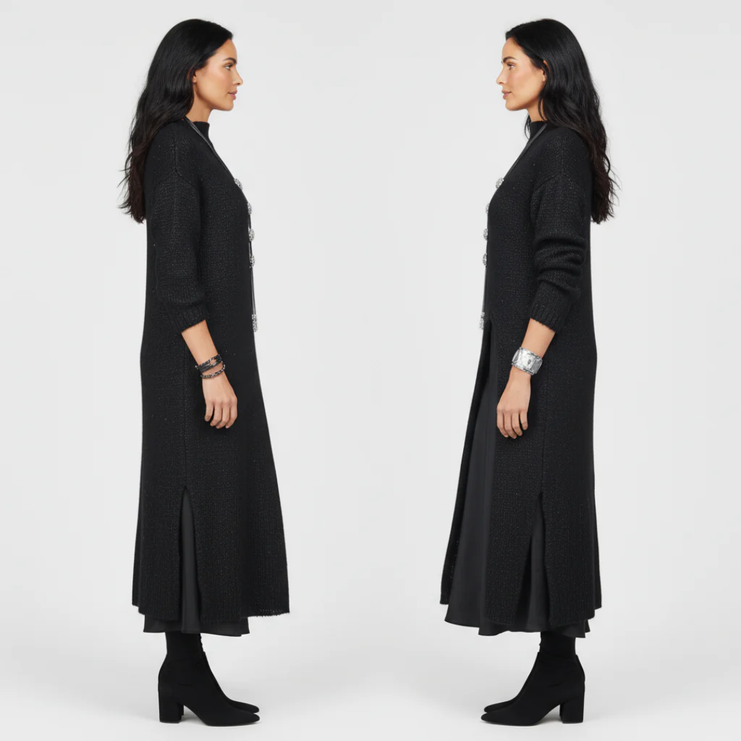 - Ajuste elegante: el jersey cae suavemente sobre el vestido, creando una silueta equilibrada y favorecedora.